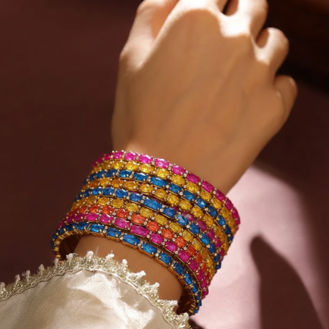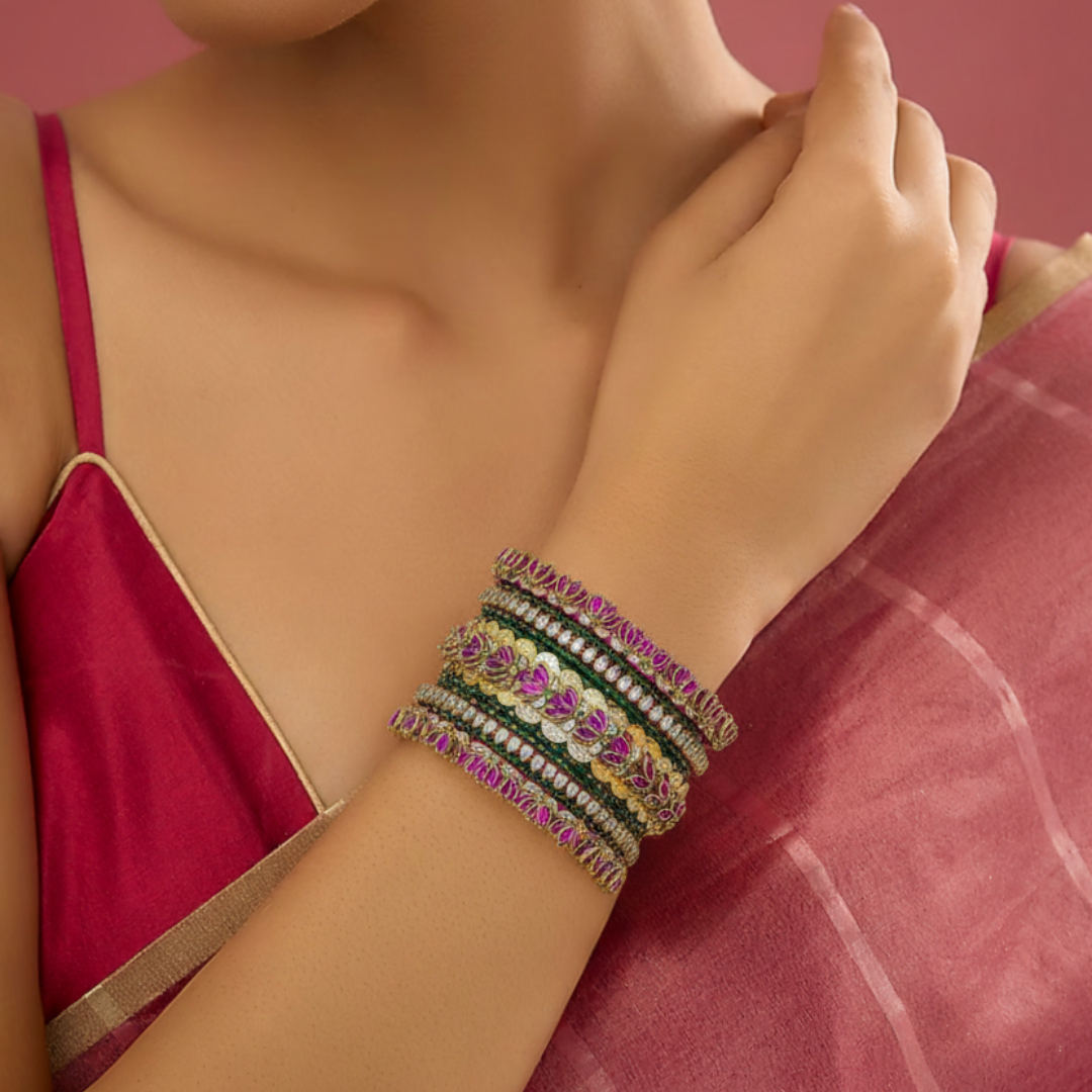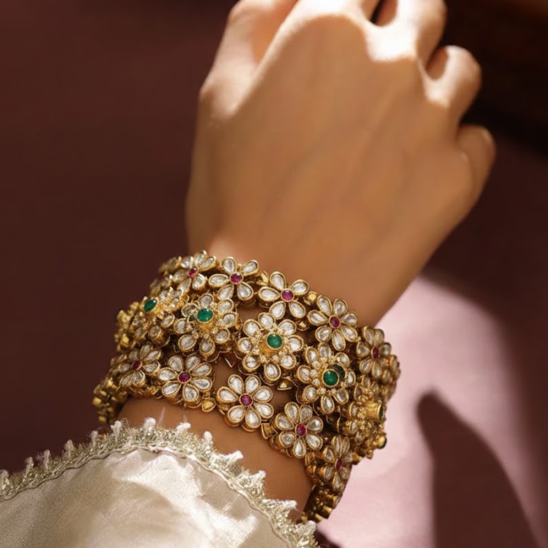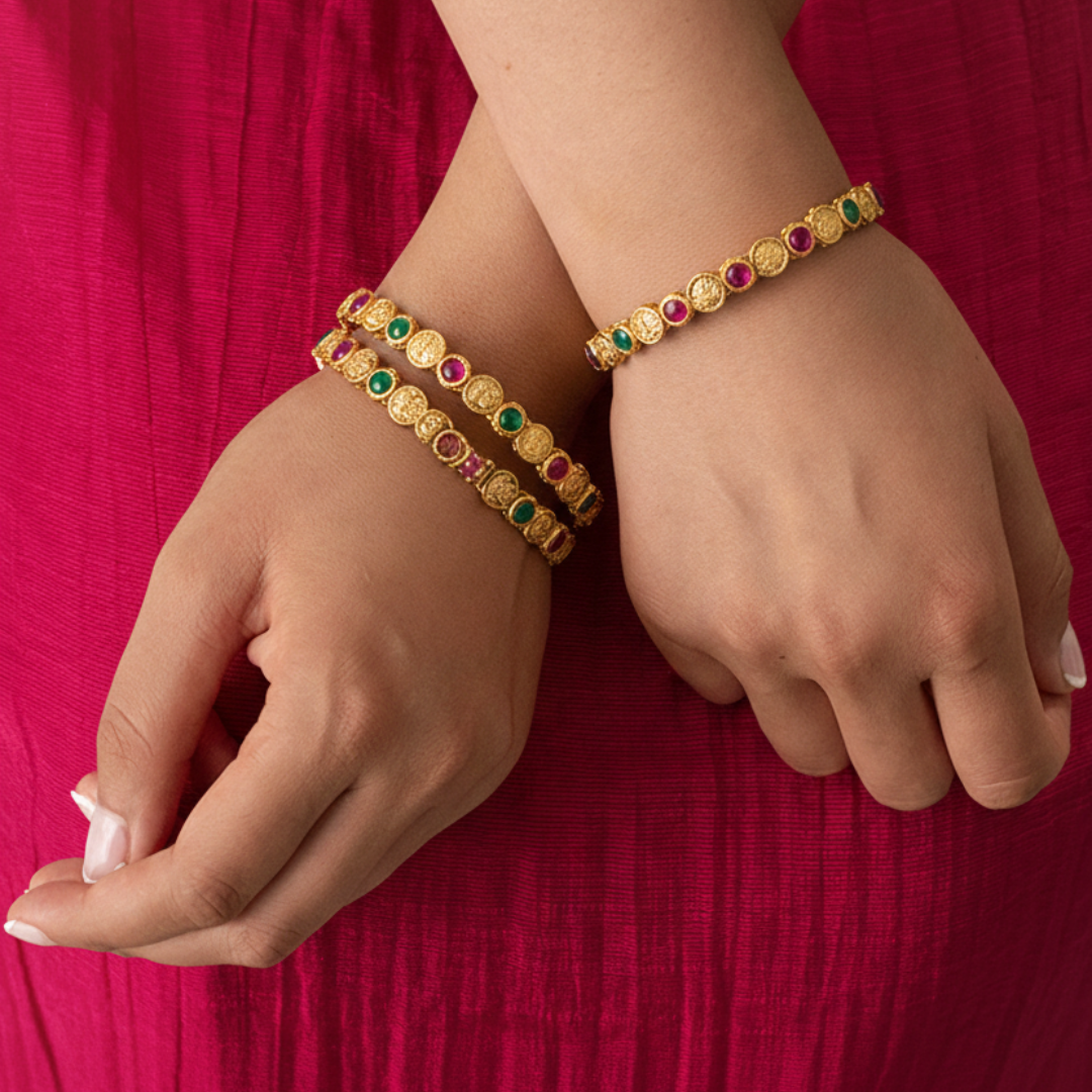 Divine Lakshmi Temple Antique Bangle – Traditional Copper-Brass Alloy with Multi-Stone Accents