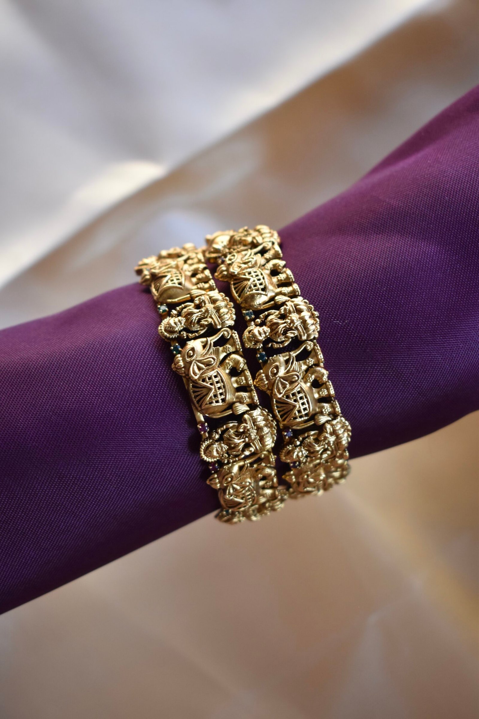 Add traditional elegance with these antique bangles featuring elephant & Lakshmi designs—perfect for weddings and special occasions.