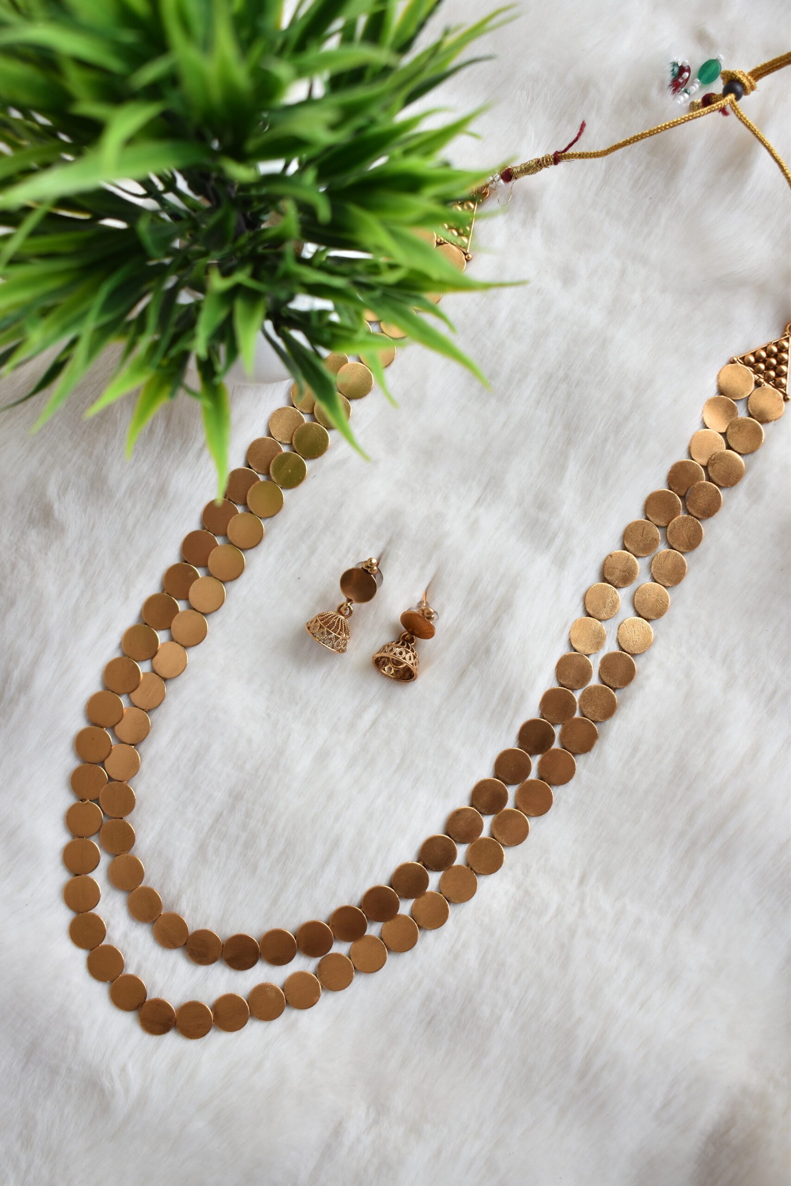 A minimalist yet grand Antique Haram Coin 2 Layer Haram featuring two sleek cascading rows of plain golden coins. This matte-finish haaram offers a modern twist on traditional jewelry, making it a versatile statement piece. It comes paired with matching delicate jhumkas for an effortless ethnic look.