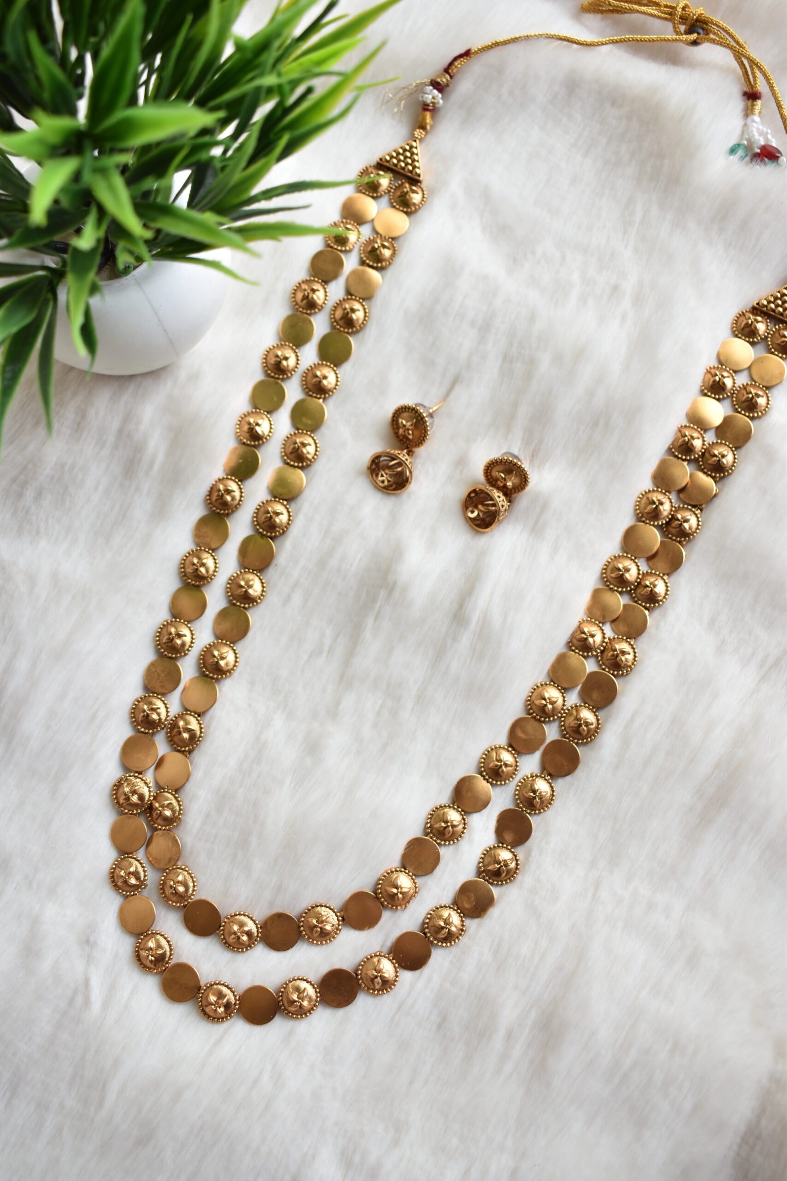 An elegant Antique Haram Coin 2 Layer Haram featuring a unique combination of embossed star-motif coins and plain golden discs. This dual-layered long haaram offers a balanced traditional look with a textured finish. Paired with matching floral-embossed jhumkas, it is perfect for any festive ethnic occasion.