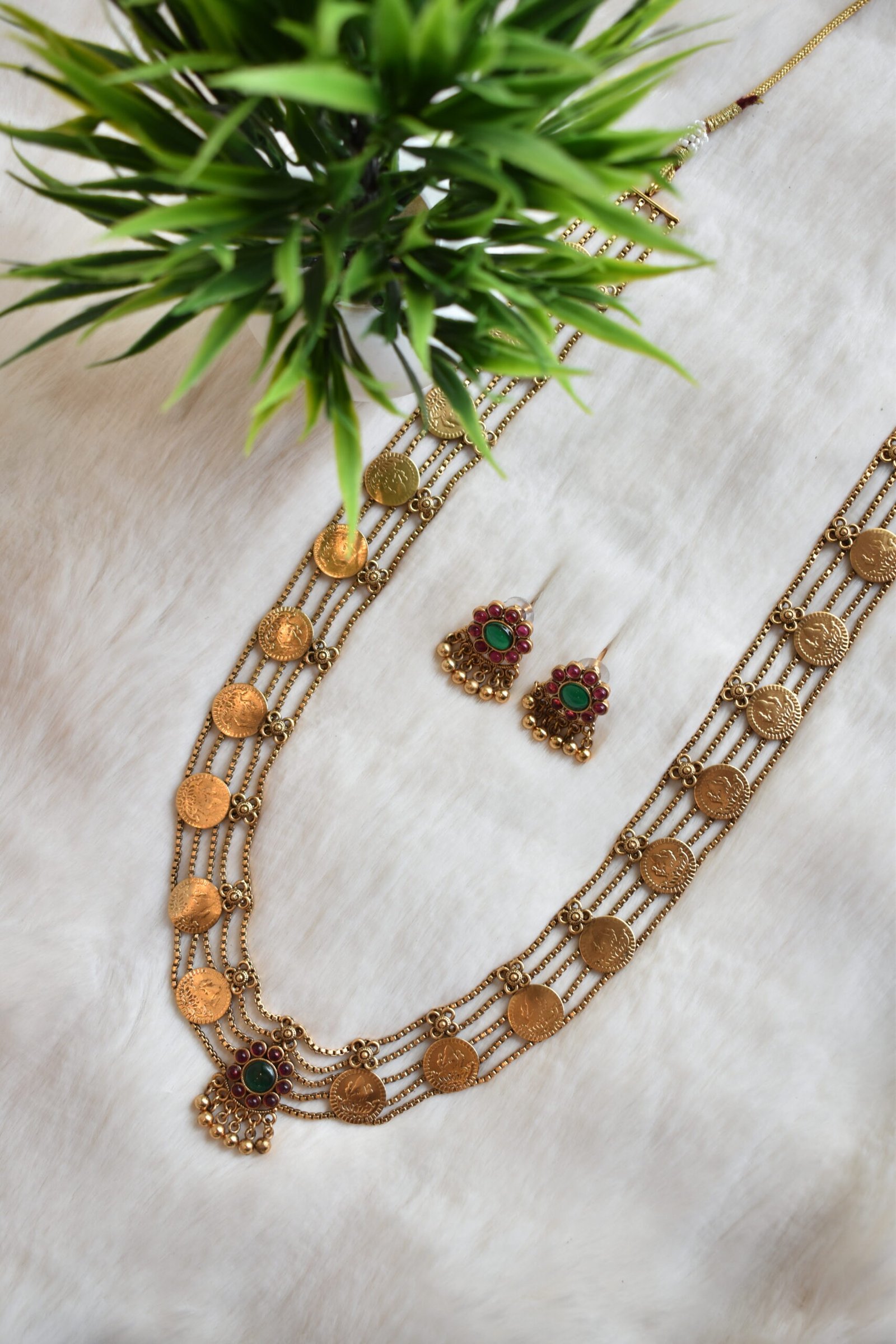 A grand Antique Haram Coin 5 Layer Haram featuring five cascading rows of traditional coins. Accented with vibrant Red and Green Kemp stones, this long-length haaram offers a rich, royal look for weddings and festivals. Comes with matching floral-themed studs.