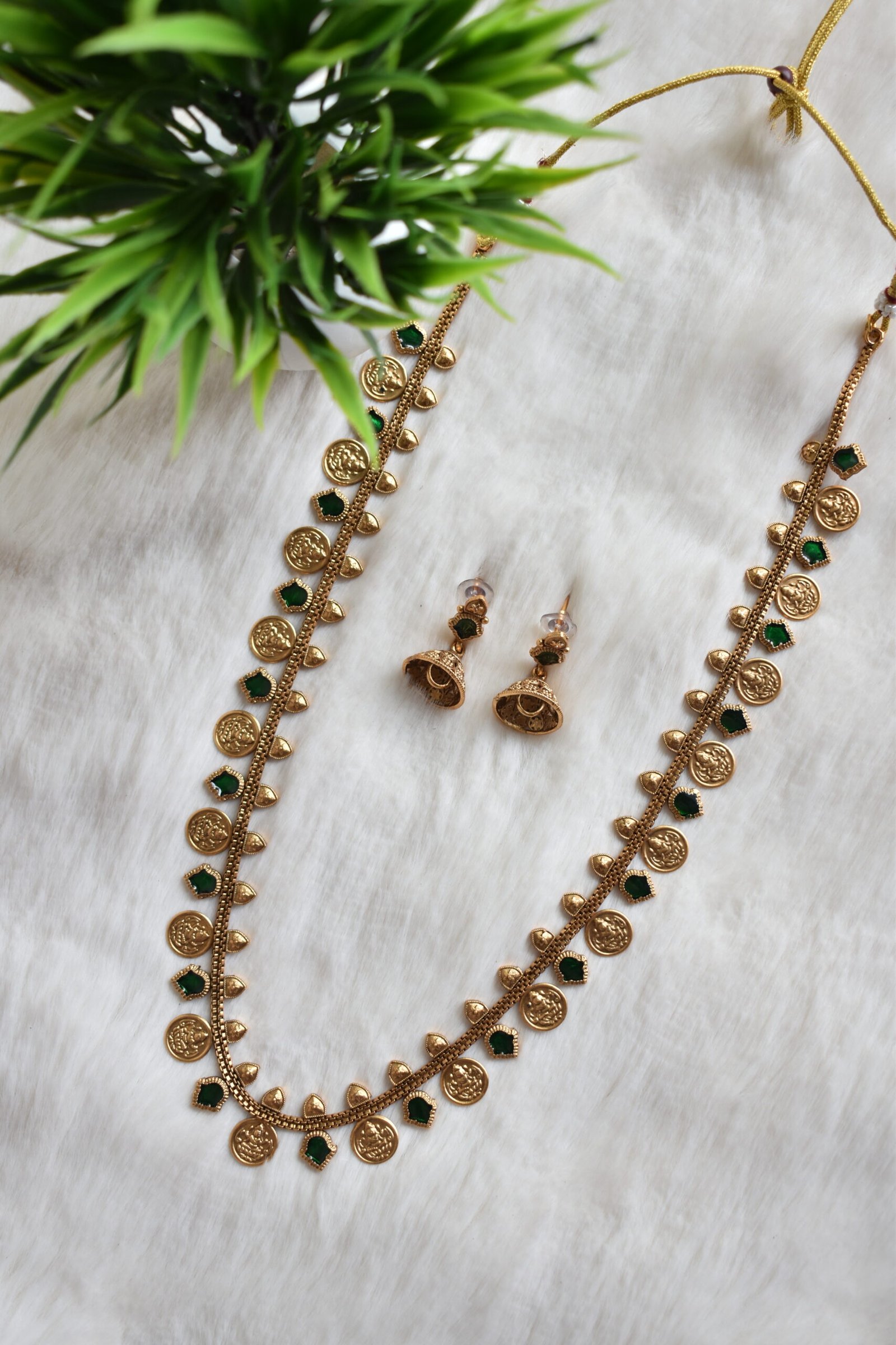 A graceful Antique Haram Coin Lakshmi Haram featuring traditional Goddess Lakshmi embossed coins. Accented with elegant Green stones, this single-layer long haaram offers a classic temple look. Paired with matching jhumkas, it is a perfect choice for festivals and traditional events.