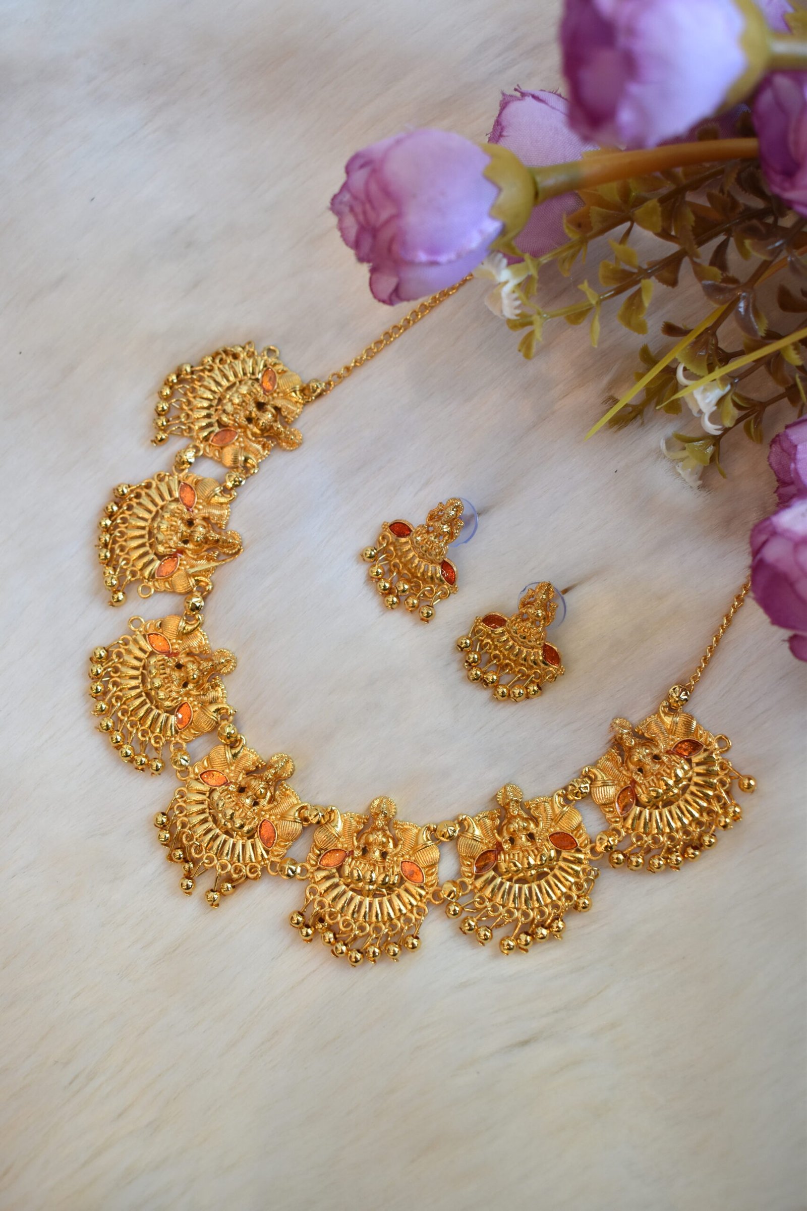 Matching Goddess Studs: Paired with beautifully coordinated Lakshmi ear studs that mirror the detailed craftsmanship of the necklace.