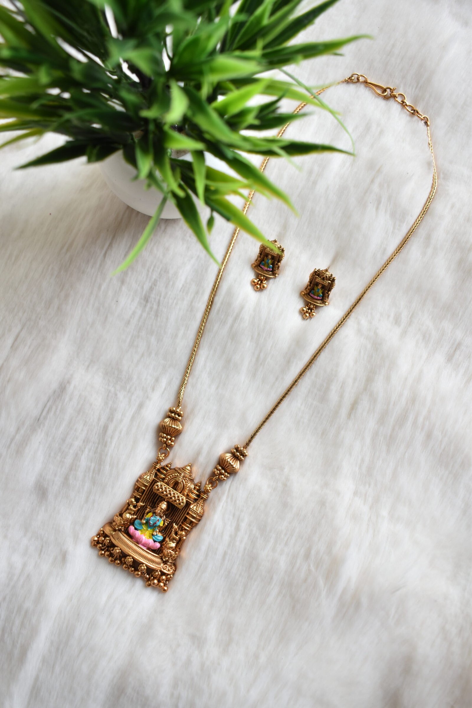 • Divine Lakshmi Pendant: Showcases a beautifully detailed temple-style pendant featuring Goddess Lakshmi seated on a lotus, finished with vibrant hand-painted accents.