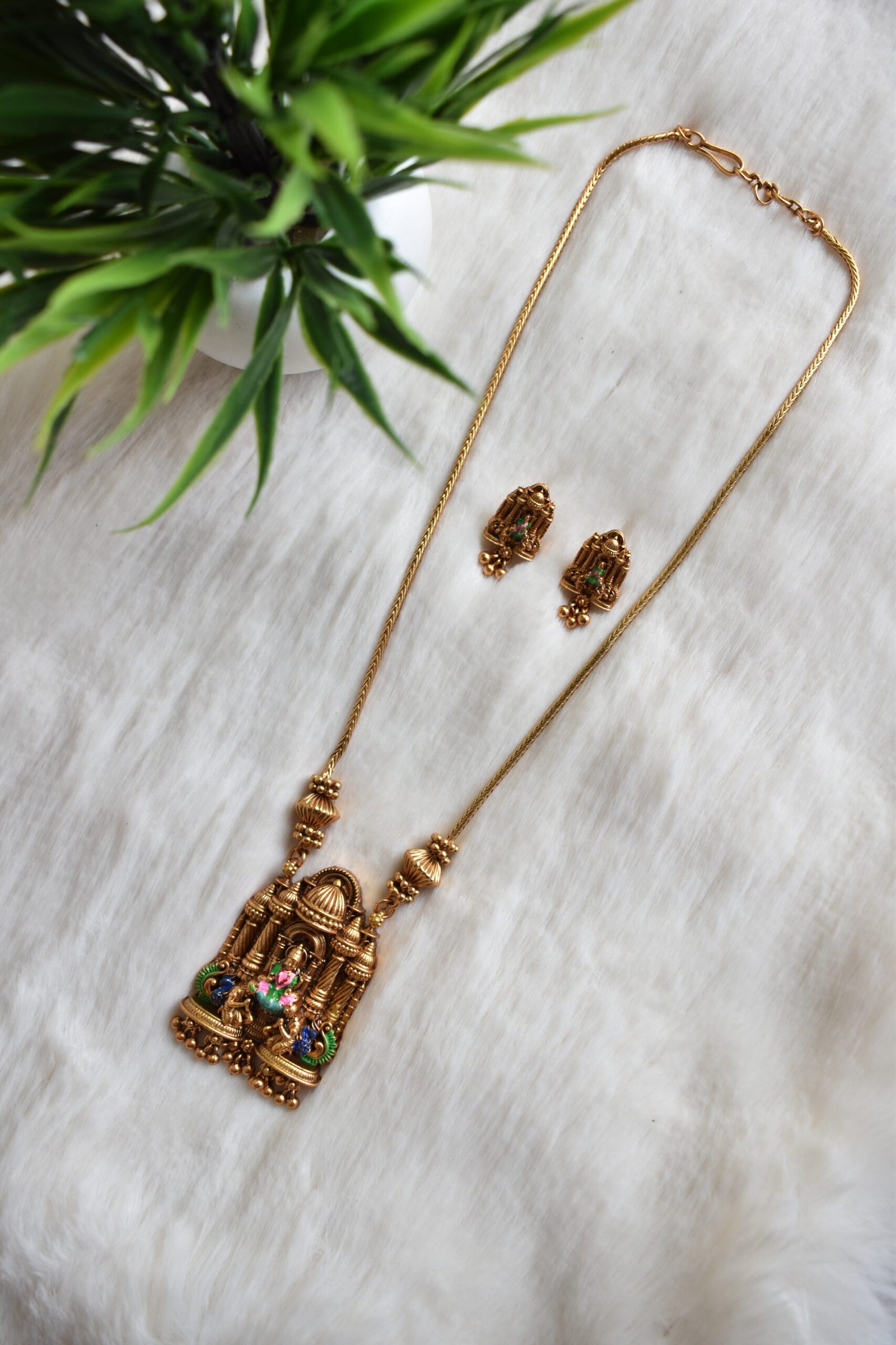 Traditional Temple Motif: Features a magnificent rectangular pendant inspired by temple architecture, showcasing a detailed Lakshmi deity seated within a sacred shrine.