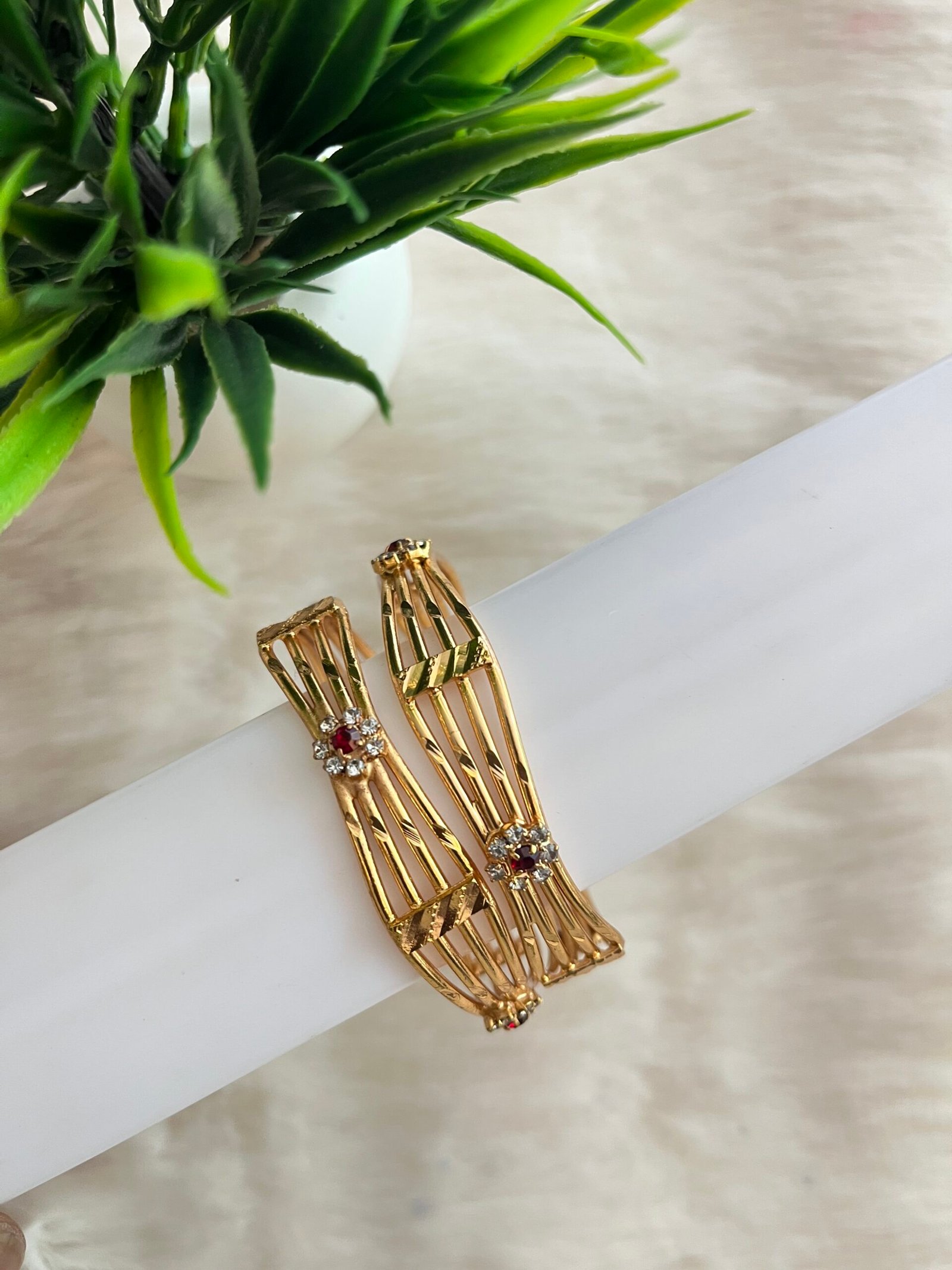 Central Floral Ruby Motif: Each bangle is adorned with a stunning central flower, featuring a deep ruby-red center stone surrounded by shimmering white accents for a touch of royal elegance.