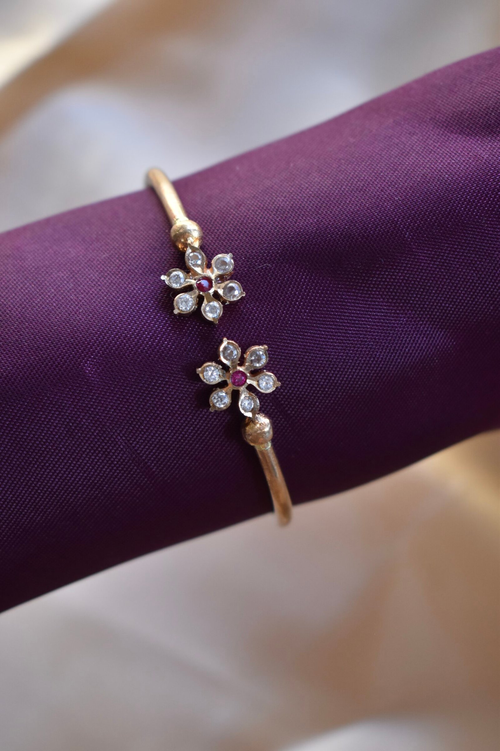 This stunning bangle features a sleek, durable wire design with two beautifully detailed floral ends. Each flower is a masterpiece, adorned with brilliant clear white stones surrounding a rich, ruby-red center stone, creating a captivating sparkle. The open-ended design allows for comfortable wear and slight adjustability.