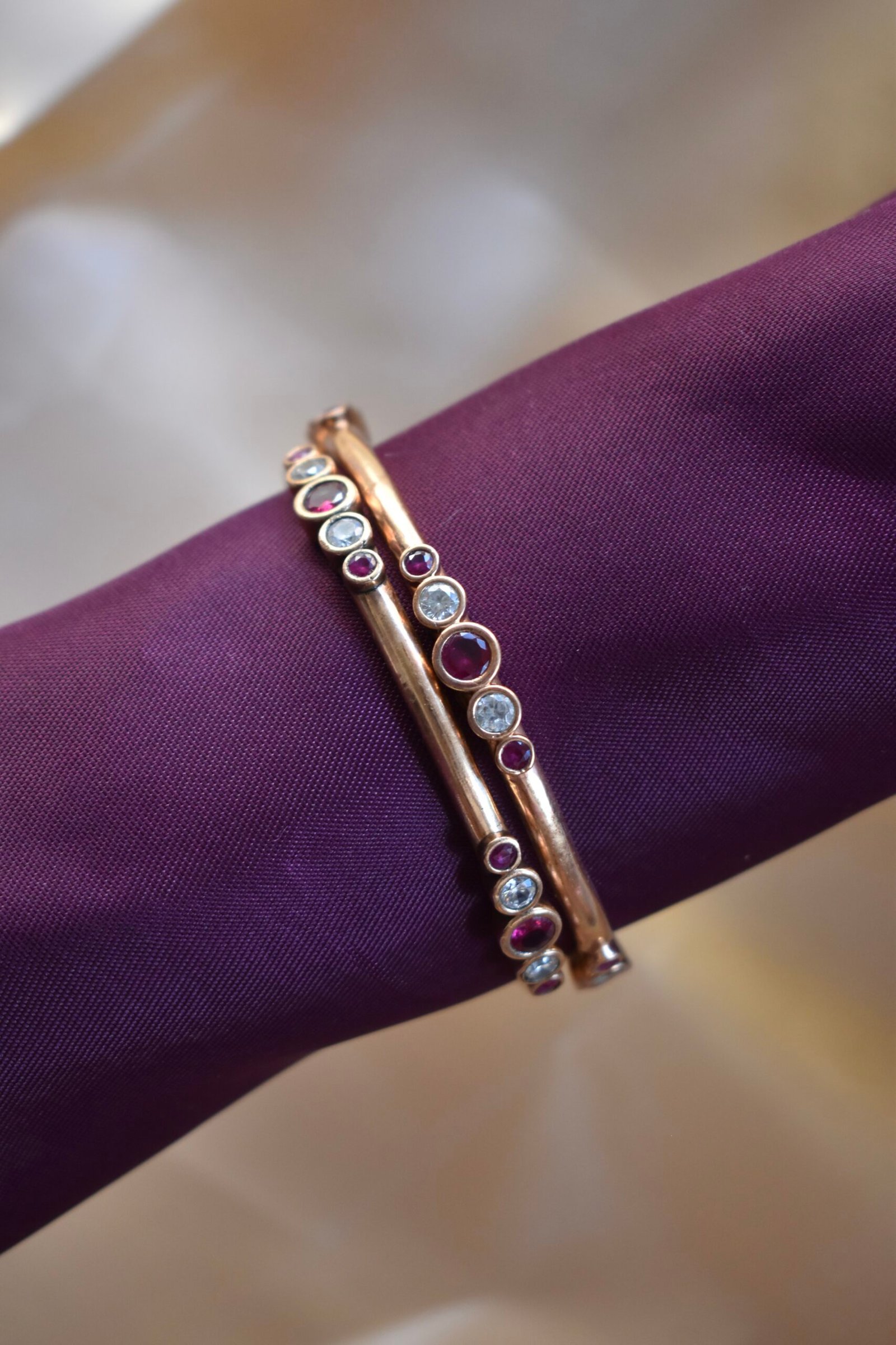 Modern Stone Arrangement: Features a stylish alternating pattern of deep ruby-red and brilliant white stones, each secured in a circular bezel setting for a sleek, contemporary look.