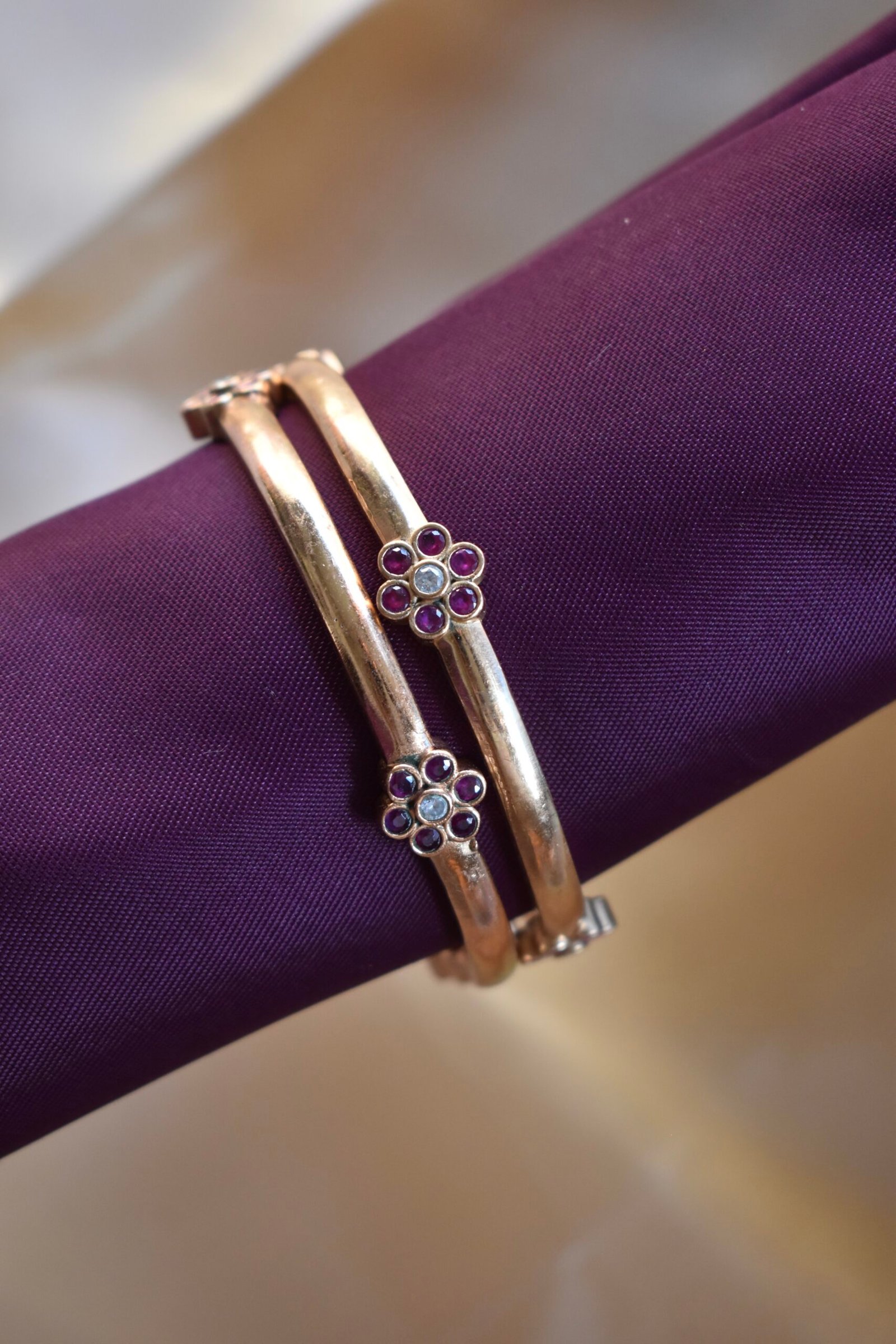 Intricate Floral Artistry: Features beautifully detailed flower-shaped motifs, each set with vibrant ruby-red stones and a sparkling white center stone for a classic ethnic look.